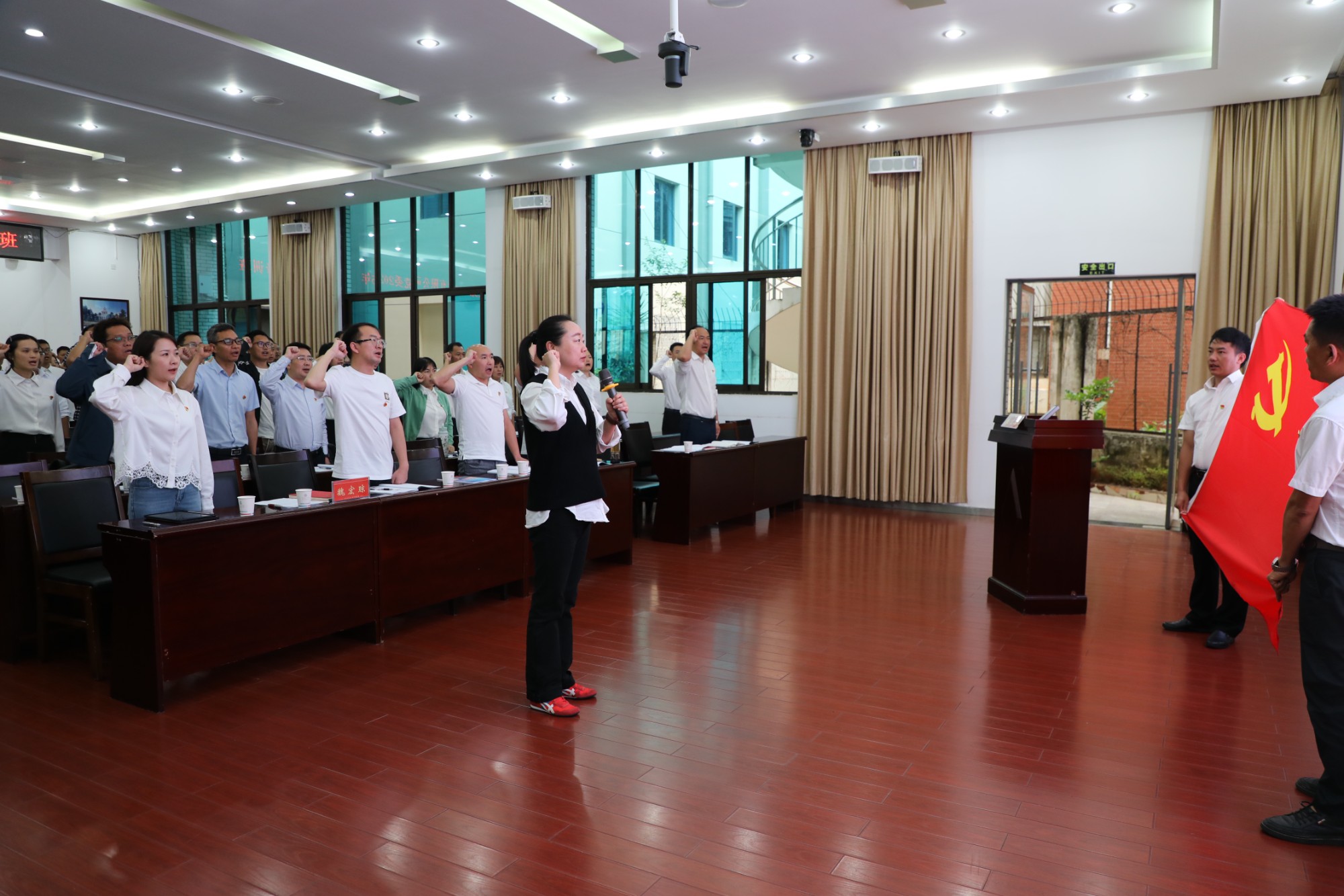 開班儀式上,全體參培人員共同唱響了《中華人民共和國國歌》,魏宏瓊帶領(lǐng)全體參培黨員重溫了入黨誓詞,并作開班動員講話。