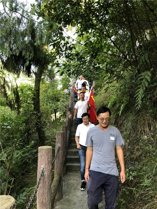 參觀了水田寨中央紅軍總部駐地舊址(花房子)后,全體黨員重走了一段長征路。入黨積極分子李偉扛著黨旗走在前面,“當年紅軍走過這里的時候,肯定沒有這樣的臺階,他們就是從沒有路走出來的路,我們很多人缺的就是這樣的開拓精神”。李偉感慨的說到。
